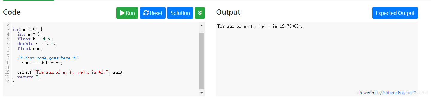 foo can be used, but since we did not initialize(初始化) it, we don't know what's in it. The variable bar contains(包含) the number 1.a, b, c, d, and e are variables, we can simply use plus, minus and multiplication(乘法) operators in the following notation, and assign(分配,赋值) a new value to a:int a = 0, b = 1, c = 2, d = 3, e = 4;a = b - c + d * e;printf("%d", a); /* will print 1-2+3*4 = 11 */ a, b, and c.#includeint main() { int a = 3; float b = 4.5; double c = 5.25; float sum; /* Your code goes here */ printf("The sum of a, b, and c is %f.", sum); return 0;}